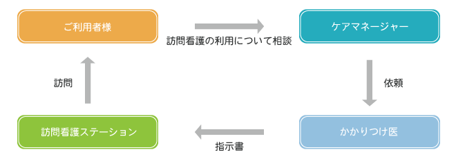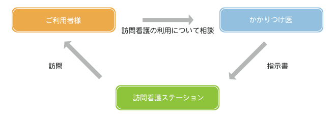 赤ちゃんからお年寄りまで年齢に関りなく訪問看護がご利用いただけます。ご利用を希望する際には、かかりつけ医にご相談ください。 訪問看護ステーションでは、かかりつけ医が交付した「訪問看護指示書」に基づき、必要なサービスを提供します。
